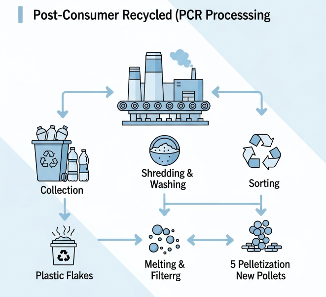 Der detaillierte PCR-Prozess: Die Reise von einer weggeworfenen Flasche zu einer neuen PCR-Kosmetikflasche ist komplex und umfasst mehrere kritische Schritte, die jeweils eine Energie- und Qualitätskontrolle erfordern: